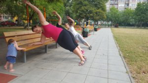 A játszótér különösen jó terep a közös mozgásra. Hintázás közben minden lökésnél csináltam egy kitörést, a kicsi jókat kacag ilyenkor. A libikóka is nagy kedvenc nálunk. Itt úgy lököm, azaz emelem-süllyesztem a picurit, hogy nagy terpeszben guggolásokat végzek. Az ő kedve irányítja az edzésemet.